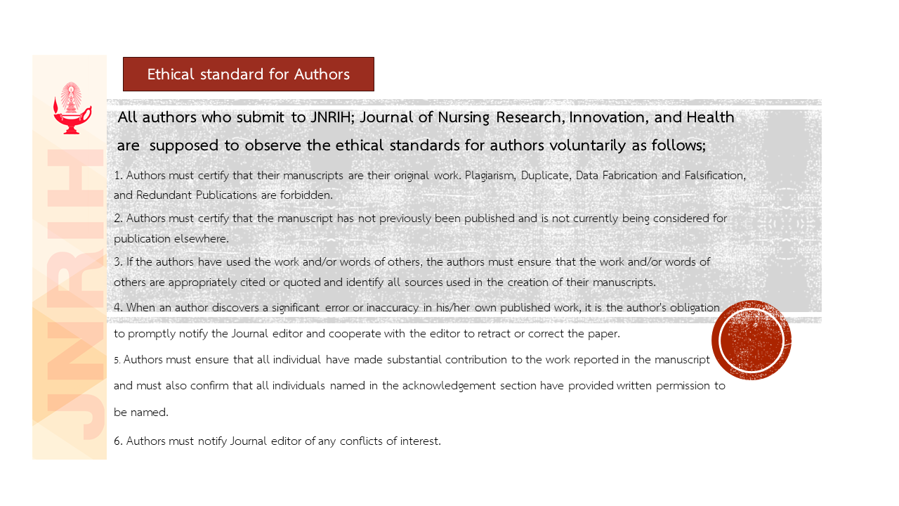 ผู้เขียนทุกท่านที่ส่งบทความไปยัง วารสารการวิจัยทางการพยาบาล นวัตกรรม และสุขภาพ (JNRIH; Journal of Nursing Research, Innovation, and Health) ต้องปฏิบัติตามมาตรฐานจริยธรรมสำหรับผู้เขียนโดยสมัครใจ ดังต่อไปนี้