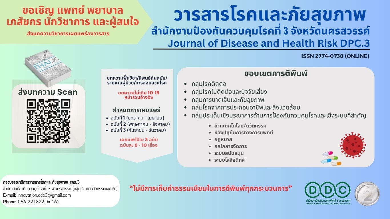 วารสารโรคและภัยสุขภาพ สำนักงานป้องกันควบคุมโรคที่ 3 จังหวัดนครสวรรค์ เป็นวารสารที่รับการตีพิมพ์เผยแพร่ ผลงานทางวิชาการ รายการวิจัย บทความ รายงานการสอบสวนโรค ให้กับนักวิชาการและผู้สนใจทางด้านโรคติดต่อ โรคไม่ติดต่อ และภัยสุขภาพ