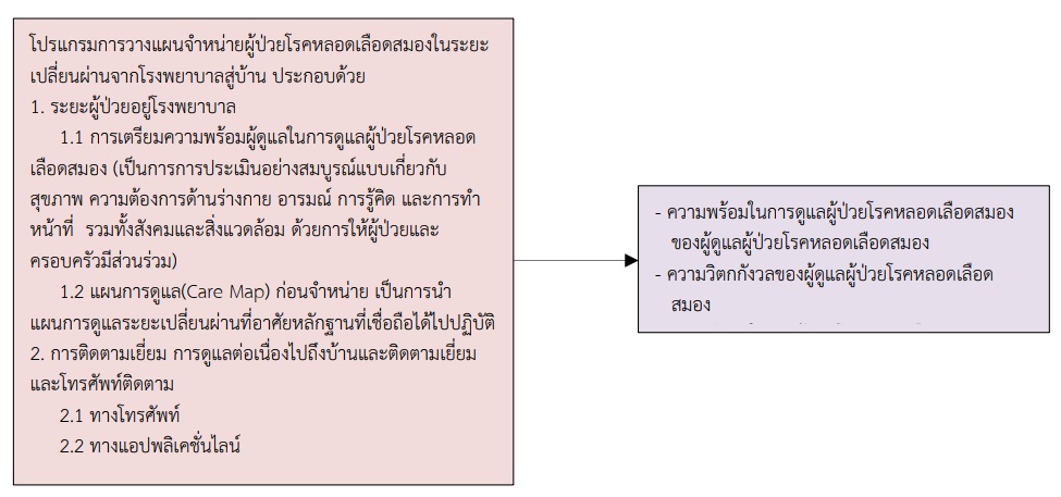 ผลการใช้โปรแกรมการวางแผนจำหน่ายผู้ป่วยโรคหลอดเลือดสมองในระยะเปลี่ยนผ่าน จากโรงพยาบาลสู่บ้านต่อความพร้อมในการดูแลก่อนกลับบ้าน ความวิตกกังวล และความพึงพอใจของผู้ดูแลผู้ป่วยโรคหลอดเลือดสมอง โรงพยาบาลสุราษฎร์ธานี