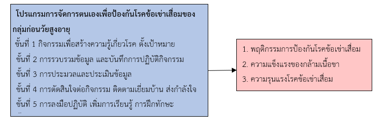 ผลของโปรแกรมการจัดการตนเองเพื่อป้องกันโรคข้อเข่าเสื่อมของกลุ่มก่อนวัยสูงอายุ