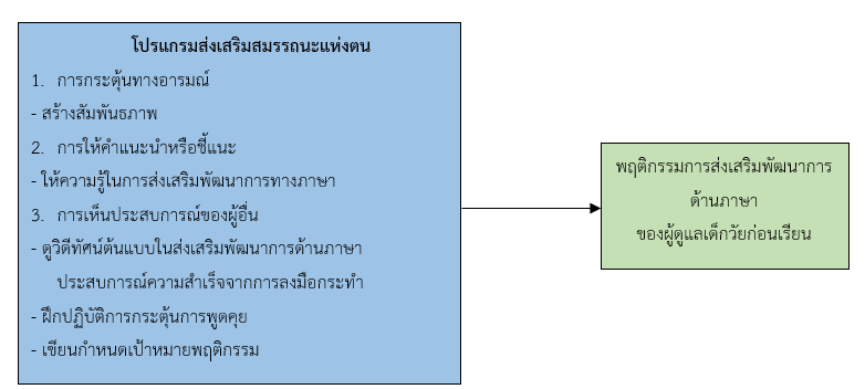 ผลของโปรแกรมส่งเสริมสมรรถนะแห่งตนต่อพฤติกรรมการส่งเสริมพัฒนาการด้านภาษาของผู้ดูแลเด็กวัยก่อนเรียน
