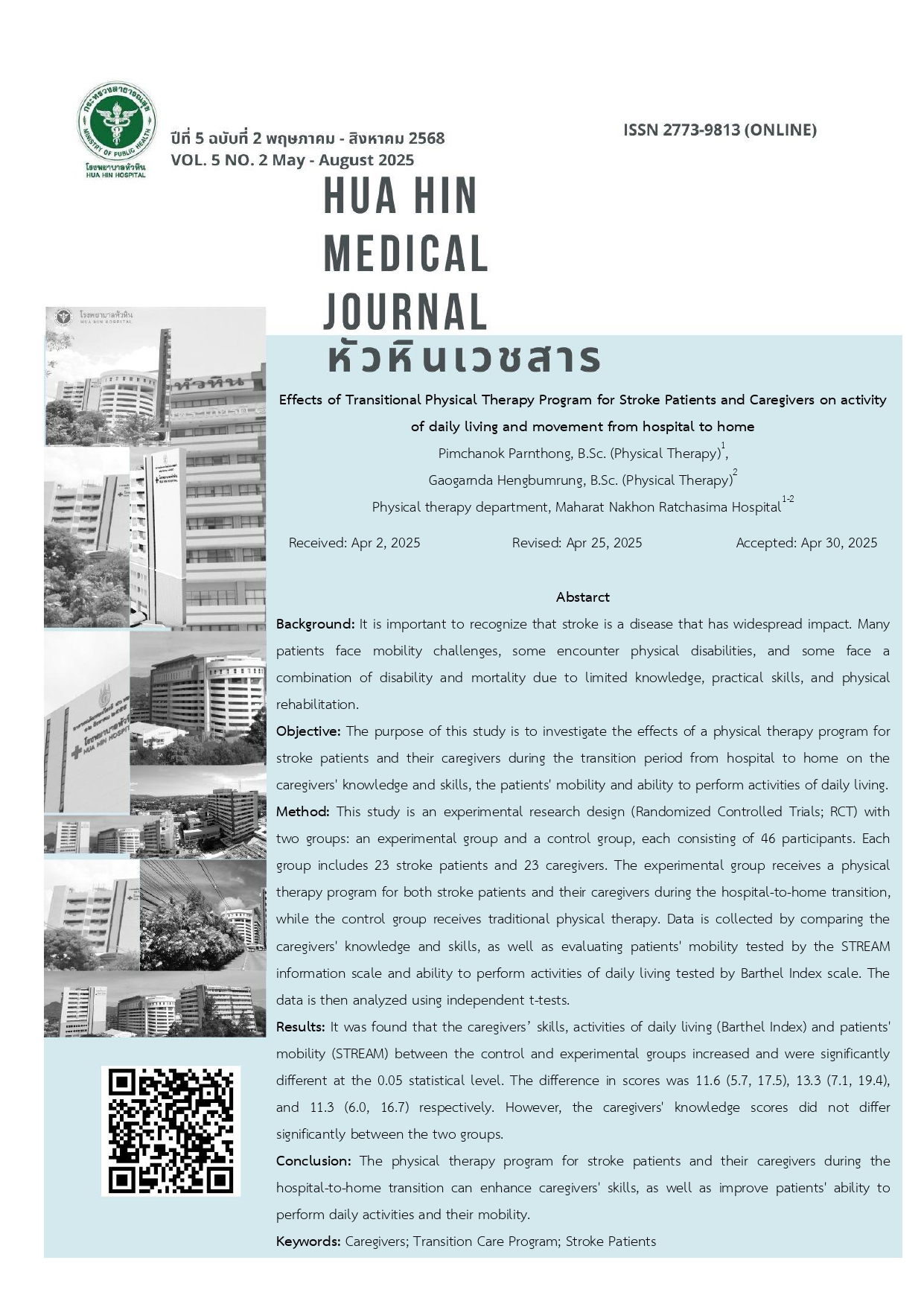 Method: This study is an experimental research design (Randomized Controlled Trials; RCT) with two groups: an experimental group and a control group, each consisting of 46 participants. Each group includes 23 stroke patients and 23 caregivers. The experimental group receives a physical therapy program for both stroke patients and their caregivers during the hospital-to-home transition, while the control group receives traditional physical therapy. Data is collected by comparing the caregivers' knowledge and skills, as well as evaluating patients' mobility tested by the STREAM information scale and ability to perform activities of daily living tested by Barthel Index scale. The data is then analyzed using independent t-tests.