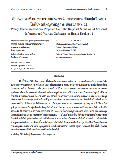 วิจัยนี้เป็นการวิจัยเชิงพรรณนา เพื่อศึกษาลักษณะทางระบาดวิทยา การระบาดเป็นกลุ่มก้อน และข้อจำกัดของมาตรการป้องกันควบคุมโรคไข้หวัดใหญ่ เพื่อเสนอแนะเชิงนโยบายต่อการควบคุมและป้องกันโรคไข้หวัดใหญ่ในเขตสุขภาพที่ 11 โดยรวบรวมข้อมูลจากระบบเฝ้าระวังโรค R506, D506 รายงานสอบสวนการระบาด รายงานสรุปผลการนิเทศติดตามการดำเนินงานป้องกันควบคุมโรค ระหว่างปี 2563–2567 วิเคราะห์ข้อมูลเชิงปริมาณด้วยสถิติเชิงพรรณนาตามมิติบุคคล เวลา และสถานที่ ตลอดจนปัจจัยที่ก่อให้เกิดการระบาด และวิเคราะห์ข้อมูลเชิงคุณภาพด้วยการสรุปผลเชิงเนื้อหาปัญหาและอุปสรรคของมาตรการควบคุมโรคที่มีอยู่ในพื้นที่ พบว่าเขตสุขภาพที่ 11 มีอัตราป่วยเพิ่มขึ้นจาก 113.51 เป็น 1,194.09 ต่อประชากรแสนคน กลุ่มอายุ 3 – 4 ปีมีอัตราป่วยสูงที่สุด การระบาดเป็นกลุ่มก้อนส่วนใหญ่เกิดในเรือนจำ ร้อยละ 71.43 จากการแพร่เชื้อจากเจ้าหน้าที่ราชทัณฑ์ถึงร้อยละ 46.15 การตรวจจับการระบาดล่าช้าเฉลี่ย 10 วันหลังวันเริ่มป่วยของผู้ป่วยรายแรก วัคซีนไข้หวัดใหญ่ครอบคลุมน้อยกว่าร้อยละ 10.00 ของประชากรทั้งหมดโดยที่เด็ก 3 – 4 ปีไม่อยู่ในกลุ่มที่ต้องได้รับวัคซีน ข้อจำกัดในการควบคุมป้องกันโรค ได้แก่ ชุดตรวจคัดกรองโรคไม่เพียงพอ ความยากลำบากในการแยกกักโรคในเรือนจำ รวมถึงข้อจำกัดด้านบุคลากรในเรือนจำ การศึกษานี้เสนอให้ขยายการให้วัคซีนให้ครอบคลุมถึงเด็กอายุ 6 เดือนถึง 4 ปี และเพิ่มความครอบคลุมของการฉีดวัคซีนให้ถึงภูมิคุ้มกันหมู่ และให้เรือนจำสามารถสำรองชุดตรวจคัดกรองโรคเพื่อให้สามารถตรวจจับการระบาดได้ทันเวลาโดยเฉพาะในกลุ่มเจ้าหน้าที่