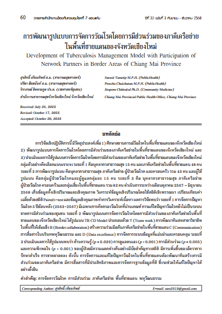 การวิจัยเชิงปฏิบัติการนี้ มีวัตถุประสงค์เพื่อ 1) ศึกษาสถานการณ์วัณโรคในพื้นที่ชายแดนของจังหวัดเชียงใหม่ 2) พัฒนารูปแบบการจัดการวัณโรคโดยการมีส่วนร่วมของภาคีเครือข่ายในพื้นที่ชายแดนของจังหวัดเชียงใหม่ และ 3) ประเมินผลการใช้รูปแบบการจัดการวัณโรคโดยการมีส่วนร่วมของภาคีเครือข่าย ในพื้นที่ชายแดนของจังหวัดเชียงใหม่ กลุ่มตัวอย่างคัดเลือกแบบเจาะจง ระยะที่ 1 คือบุคลากรสาธารณสุข 15 คน และภาคีเครือข่ายในพื้นที่ชายแดน 48 คน ระยะที่ 2 การพัฒนารูปแบบ คือบุคลากรสาธารณสุข ภาคีเครือข่าย ผู้ป่วยวัณโรค และครอบครัว รวม 43 คน และกลุ่มผู้ใช้รูปแบบ คือกลุ่มผู้ป่วยวัณโรคและผู้ดูแลกลุ่มละ 15 คน ระยะที่ 3 คือ บุคลากรสาธารณสุข ภาคีเครือข่าย ผู้ป่วยวัณโรค ครอบครัวและกลุ่มเสี่ยงในพื้นที่ชายแดน รวม 82 คน ดำเนินการระหว่างเดือนตุลาคม 2567 – มิถุนายน 2568 เก็บข้อมูลทั้งเชิงปริมาณและเชิงคุณภาพ วิเคราะห์ข้อมูลเชิงปริมาณโดยใช้สถิติเชิงพรรณนา เปรียบเทียบค่าเฉลี่ยด้วยสถิติ Paired t-test และข้อมูลเชิงคุณภาพทำการวิเคราะห์เนื้อหา ผลการวิจัยพบว่า ระยะที่ 1 การจัดการปัญหาวัณโรค 5 ปีย้อนหลัง (2563-2567) มีเฉพาะการคัดกรองวัณโรคที่ผ่านเกณฑ์ การแก้ไขปัญหาวัณโรคยังไม่เป็นระบบ ขาดการมีส่วนร่วมของชุมชน ระยะที่ 2 พัฒนารูปแบบการจัดการวัณโรคโดยการมีส่วนร่วมของภาคีเครือข่ายในพื้นที่ชายแดนของจังหวัดเชียงใหม่ ได้รูปแบบ TB CD Model ประกอบด้วย T (Team work) การพัฒนาทีมสหสาขาวิชาชีพในพื้นที่ให้เข้มแข็ง B (Border collaboration) สร้างความร่วมมือกับภาคีเครือข่ายในพื้นที่ชายแดน C (Communication) การสื่อสารในบริบทพหุวัฒนธรรม และ D (Data excellence) การจัดการระบบข้อมูลที่แม่นยำและครอบคลุม ระยะที่ 3 ประเมินผลการใช้รูปแบบพบว่า ด้านความรู้ (p = 0.039) การดูแลตนเอง (p < 0.001) การมีส่วนร่วม (p = 0.005) และความพึงพอใจ (p < 0.001) ของผู้ป่วยมีความแตกต่างกันอย่างมีนัยสำคัญทางสถิติ มีการเพิ่มขึ้นของอัตราการรักษาสำเร็จ การขาดยาลดลง ดังนั้น การจัดการและแก้ไขปัญหาวัณโรคในพื้นที่ชายแดนต้องพัฒนาทีมสร้างการมีส่วนร่วมของภาคีเครือข่าย มีการสื่อสารที่มีประสิทธิภาพและการจัดการฐานข้อมูลที่ดี ซึ่งจะช่วยให้แก้ไขปัญหาได้อย่างยั่งยืน