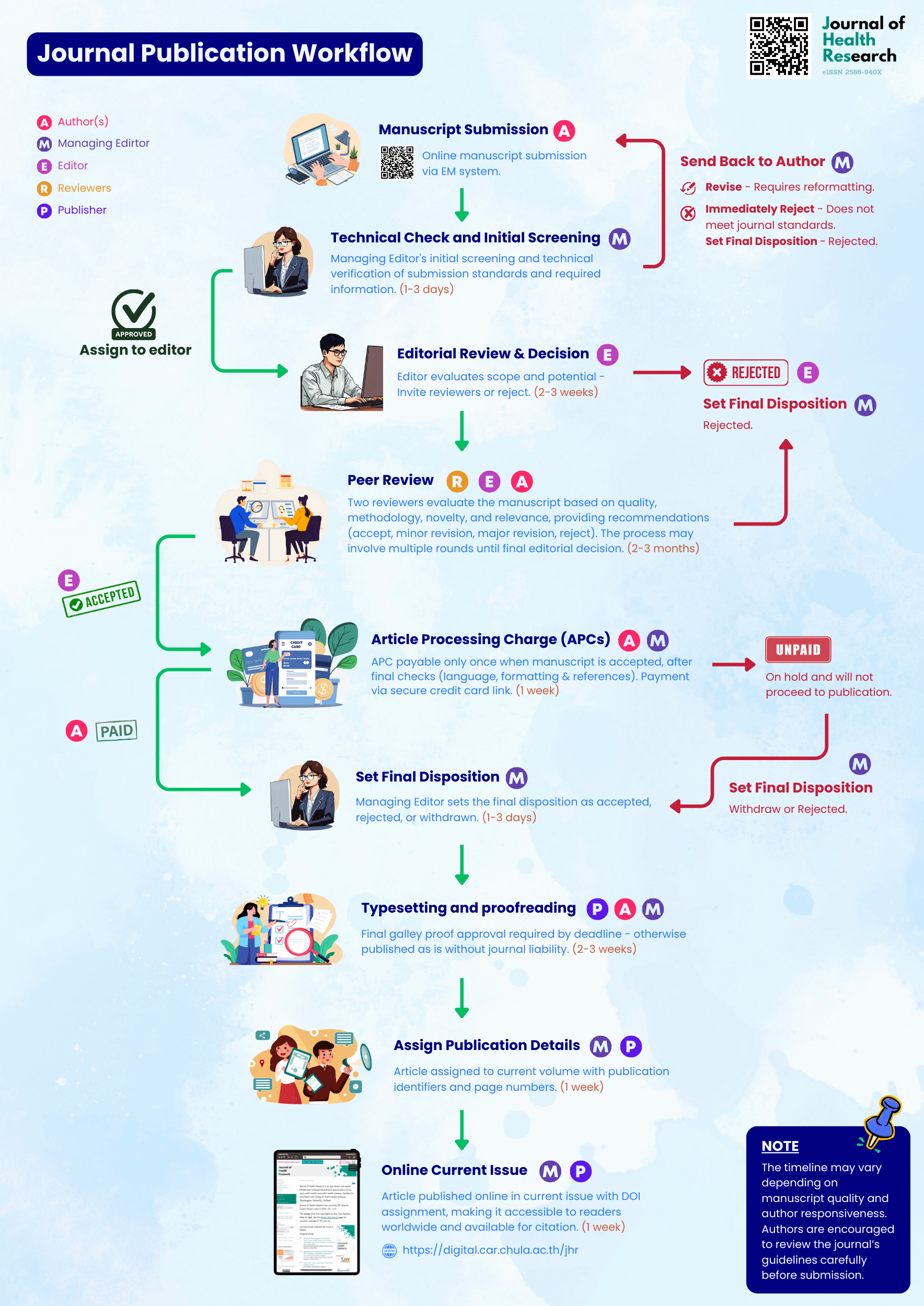 Journal of Health Research (J Health Res) is an open-access and double blinded peer-reviewed international journal by the College of Public Health Sciences, Chulalongkorn University, Thailand. J Health Res is devoted to research and current trends in the area of both public health and public health sciences. The journal currently publishes six issues per annum (February, April, June, August, October, and December). From time to time, J Health Res also publishes supplements issue such as conference proceedings. The journal has been indexed in the Scopus since 2018.