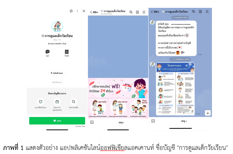 The results revealed that 1) the health knowledge and counseling model via the LINE OA application, named "School-Aged Children Care," presented knowledge through infographics and provided a channel for inquiries via a message box. 2) Following the implementation of the model, parents exhibited a statistically significant increase in their confidence in caring for school-aged children (t = 9.93, p < 0.001), and the overall satisfaction was high for both parents (M = 4.40, S.D. = 0.54) and professional nurses (M = 4.54, S.D. = 0.51). These findings suggest healthcare professionals should use LINE OA for health education and counseling, as it's an accessible, straightforward, and modern platform enabling parents to review information independently.
