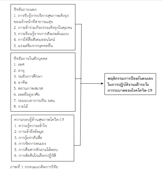 The results of the study revealed that the VHVs had a very good level of both health literacy of covid-19 (85.12%) and self-protective behaviors (80.24%). he factors that significantly affected health literacy at the .05 level, classified by aspect, were knowledge and understanding, with only one factor, social media use, predicting 2.54 percent. Three factors could be predicted for access to information to a degree of 17.92 percent were: area of residence, participation in community proactive activities, and learning from model observation. Four factors could be predicted for media literacy to a degree of 22.45 percent were: income, perceptions of proactive health services by health care workers, participation in community proactive activities, and learning from model observation. Three factors could be predicted for self-management to a degree of 12.73% were: income, participation in community proactive activities, and learning from model observation. Four factors could be predicted for communication questioning and interaction to a degree of 18.40% were: income, perceptions of proactive health services by health care workers, participation in community proactive activities, and learning from model observation. Factors that significantly influenced self-protective behavior at the .05 level included health literacy, self-management, access to information and decision-making, as well as residential area factors, which together predicted 40.90 percent.